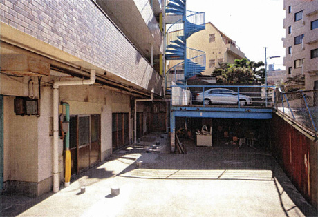 写真右側のアルコーブ奥の盤は東京電力の借室となっています。改修による露出上水配管が建物を古く見せている点が問題点です。また、サブエントランスドアが既製品のアルミドアであることが良くありません。