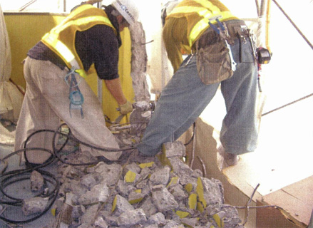 本工事の大きな特徴です。手すり壁のハンドクラッシャーによる静音解体を行いました。ハサミのようにかみ砕いて解体することで打撃音がマンションに響き渡らないように配慮しています。